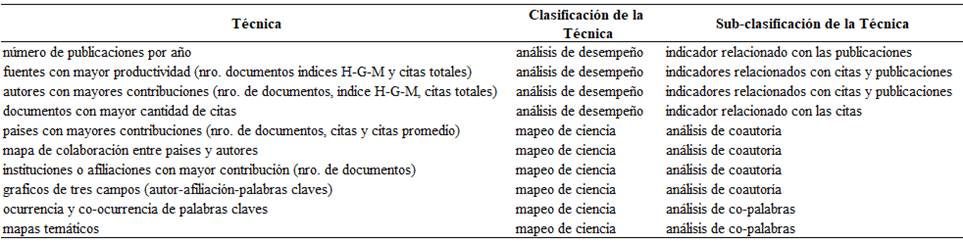 Tabla. 1. Resumen de técnicas bibliométricas aplicadas en el estudio.