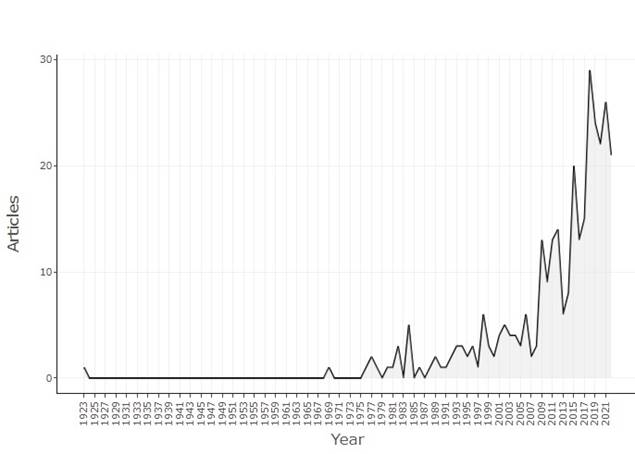 Figura. 2. Evolución del número de publicaciones ente los años 1923 a 2022.