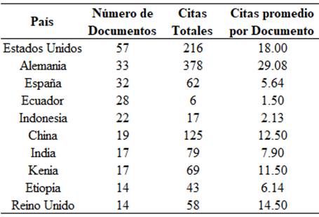 Mediante la tabla 3 a continuación se presenta el listado de los diez países que mayores contribuciones han realizado a la productividad científica en el campo del COAC. La tabla a continuación se ordena de mayor a menor considerando el número de documentos publicados y además por cada país se indican las citas totales así como las citas promedio por documento.