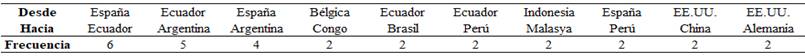 De la revisión de las cifras relacionadas con la colaboración entre países, destacan las co-autorías entre: (1) España y Ecuador con 6 colaboraciones, (2) Ecuador y Argentina con 5 colaboraciones y (3) España y Argentina con 4 colaboraciones. A diferencia de otros campos de investigación científica, en donde es frecuente observar que el liderazgo de los países y colaboraciones se explica principalmente por países desarrollados, es destacable el liderazgo y colaboración que evidencian los países iberoamericanos en lo relacionado al COAC como frente investigación.