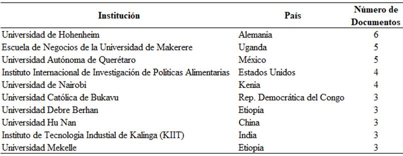 A partir de los datos presentados en la tabla precedente, se observa que la entidad que evidencia el mayor número de contribuciones es la Universidad de Hohenheim en Alemania con 6 publicaciones, seguida por la Escuela de Negocios de la Universidad de Makerere en Uganda y la Universidad Autónoma de Querétaro en México cada una con 5 publicaciones registradas. En tercer término, destacan con 4 publicaciones el Instituto Internacional de Investigación de Políticas Alimentarias de Estados Unidos, así como también la Universidad de Nairobi en Kenia también con 4 publicaciones.