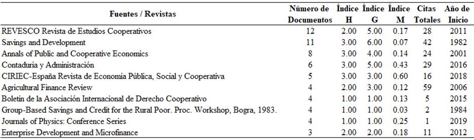 Los resultados presentados en la tabla anterior muestran que la fuente que lidera en cuanto al número de documentos publicados, es la Revista de Estudios Cooperativos REVESCO de la Universidad Complutense de Madrid, fuente que registra 12 documentos publicados, 28 citas totales e índices H=2, G=5 y M=0,17. Esta revista se encuentra vigente a la fecha del presente estudio y de acuerdo al ranking SCImago figura en el cuartil 2 (Q2) en el área de ciencias sociales[3]. En segundo lugar se encuentra la revista Saving and Development la cual contabiliza 11 publicaciones, 42 citas e índices H=3, G=6 y M=0,07. Esta revista se encuentra con cobertura descontinuada en Scopus ya que registra actividad entre los años 1982 y 2016[4]. Saving and Development fue una revista publicada por la Fundación Giordano Dell’Amore con locación en Italia. En tercer término, se observa la revista Annals of Public and Cooperative Economics la cual registra 8 publicaciones, 24 citas e índices H=3, G=4 y M=0,14. Esta revista evidencia cobertura por parte de la base de datos Scopus en dos periodos, el primero entre los años 1925 y 1942, y luego desde 1948 hasta la actualidad. Esta tercera revista es publicada por la compañía editorial científica Wiley-Blackwell con sede en Nueva Jersey en los Estados Unidos[5].
