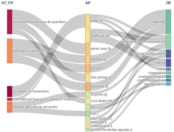 En congruencia con lo presentado en la tabla 6 acerca de los autores que registran mayor productividad científica en el COAC como campo de investigación, la figura 4 precedente lista nuevamente a los principales autores, con la afiliación respectiva de los documentos publicados, además de los principales temas de investigación. Por ejemplo, en primer lugar destaca el autor Manfred Zeller cuyas investigaciones figuran afiliadas principalmente a la Universidad de Hohenheim y al Instituto Internacional de Investigaciones sobre Políticas Alimentarias (IFPRI), y dentro de los principales temas de investigación de este autor destacan las cooperativas de ahorro y crédito, sostenibilidad financiera y el crédito. En segundo lugar, destacan las autoras Patricia Santana, Laura Lanzarini y el autor Aurelio Bariviera, cuyas publicaciones se encuentran principalmente afiliadas a la Universidad Nacional de la Plata y sus temas de investigación se centran en el riesgo de crédito. Finalmente, y en tercer término, destaca el autor Girma J. Duguma cuya producción científica se encuentra afiliada principalmente a la Universidad Agrícola Nanjing y sus temas de investigación también se centran en sostenibilidad financiera.