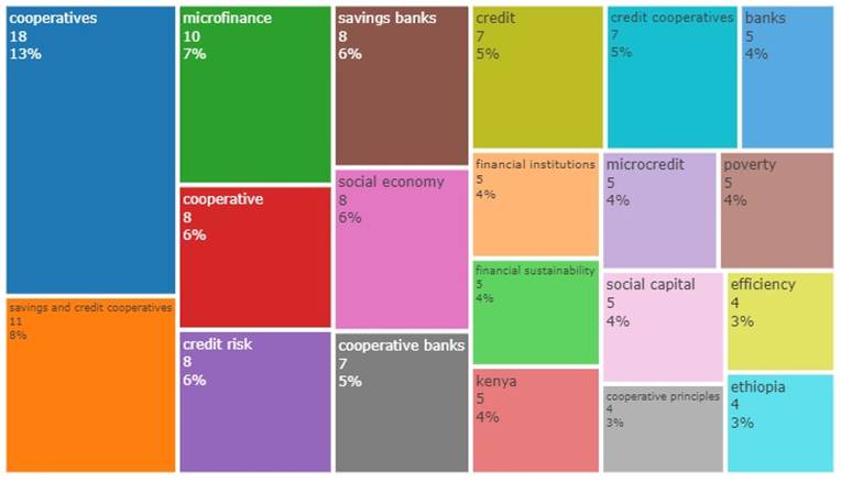 Tal como se presenta en la figura anterior, se observa que el concepto cooperativas se constituye como la palabra clave que registra la mayor cantidad de ocurrencias con 18 menciones lo que representa un 13% del total de palabras claves. En segundo lugar se encuentra el concepto de cooperativas de ahorro y crédito con 11 menciones lo que equivale a un 8% del total. En tercer lugar de importancia se encuentra el concepto de microfinanzas con 10 menciones lo que corresponde a un 10% del total. Finalmente, y con el propósito de evidenciar la diversidad de conceptos en los que se centran las investigaciones en el campo del COAC, se observan en cuarto lugar en el orden de ocurrencias las palabras claves: cooperativa, riesgo de crédito, cajas de ahorro y economía social, donde cada uno de estos conceptos registra 8 ocurrencias lo que equivale a un 6% del total en cada caso.