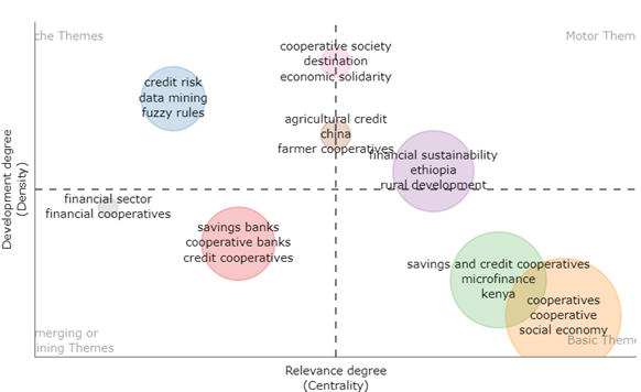 Los resultados de la figura anterior representan que dentro los temas motores (cuadrante superior derecho), se encuentran: (1) sostenibilidad financiera, (2) Etiopía, (3) desarrollo rural, (4) sociedades cooperativas, (5) economía solidaria, (6) crédito agrícola, (6) China y (7) cooperativas de agricultores. En segundo término, los temas de investigación especializados con alto nivel de desarrollo pero periféricos (cuadrante superior izquierdo) se encuentran: (1) riesgo de crédito, (2) minería de datos y (3) reglas difusas. En tercer lugar, dentro de los temas de investigación importantes dentro del COAC pero con bajo nivel de desarrollo se encuentran: (1) cooperativas de ahorro y crédito, (2) microfinanzas, (3) Kenia (4) cooperativas y (5) economía social. Por último, dentro de los temas de investigación que podrían considerarse como emergentes o en declive (cuadrante inferior izquierdo) se encuentran: (1) cajas de ahorro, (2) bancos cooperativos, (3) cooperativas de crédito, (4) sector financiero y (5) cooperativas financieras.