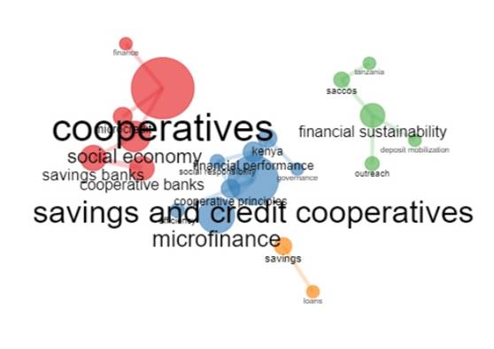 En la figura anterior se distinguen tres nodos importantes, los que por tener dos o más interconexiones con otras palabras claves constituyen temas centrales dentro de la investigación asociada al COAC. El primer tema central, por el tamaño del nodo, es el identificado con la palabra cooperativas, tema que evidencia sus principales interconexiones con palabras claves tales como: economía social, microcrédito, bancos cooperativos y cajas de ahorro. Como segundo tema central se encuentra el concepto de cooperativas de ahorro y crédito, tema que presenta sus principales interconexiones con palabras claves tales como: microfinanzas, desempeño financiero, principios cooperativos, Kenia, responsabilidad social, gobernanza y eficiencia. En tercer término, se encuentra como tema central el concepto de sostenibilidad financiera el que a su vez presenta sus principales interconexiones con palabras claves como: movilización de depósitos, Tanzania, SACCOs[6] y alcance.