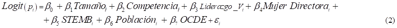 Como se ha explicado anteriormente, la calidad en la administración de los centros es muy importante, por esta razón, se tratará de estimar la relación que existe entre las principales variables que afectan a los centros relacionadas con la titularidad, el género, los directores de los centros y su formación, el tamaño del centro, etc. Para explicar qué variables influyen en la gestión de los diferentes centros educativos por parte de su dirección se ha planteado el siguiente modelo[5] de sección cruzada: