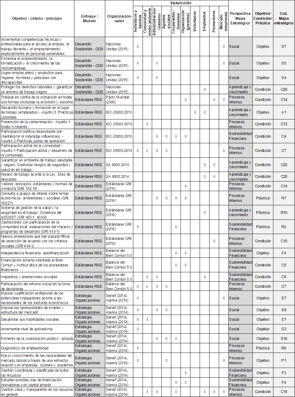 Fuente: Elaboración propia con datos de GRI (2018), Naciones Unidas (2009), Organización Internacional de Normalización - ISO (2010), Social Accountability International (2014) y Blachfellner et al. (2017)