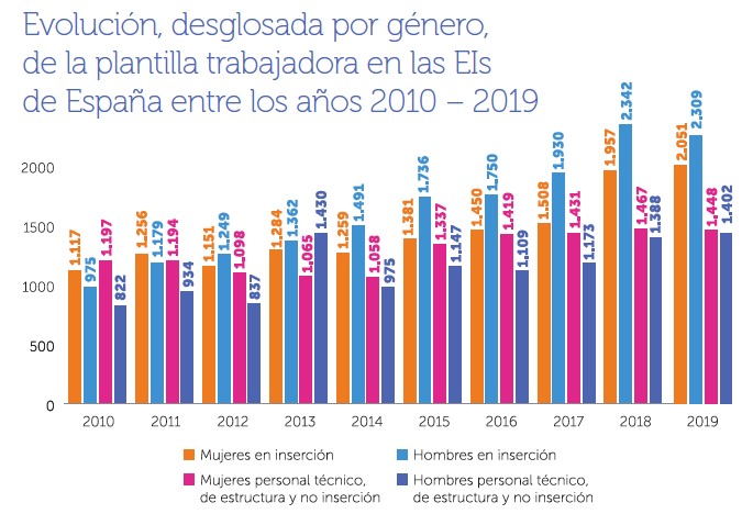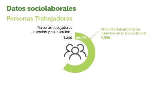 En cuanto a los datos sociolaborales, en ese mismo balance se señala que en 2019, las empresas de inserción de FAEDEI emplearon a 7.210 personas (3.499 mujeres y 3.711 hombres) de las cuales 4.360 (60,47%) eran personas trabajadoras en proceso de inserción y el resto personal de estructura, personal técnico de acompañamiento y de gerencia y administración.