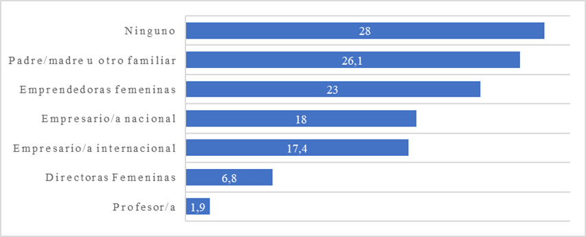 En lo personal, aproximadamente un tercio (28%) declaró que no se inspiró en ningún referente a la hora de emprender, aunque un 26,1% cita a alguno de sus padres u otro familiar (ver gráfico más abajo). Asimismo, otras emprendedoras sirvieron de referente a un 23%, dato que se solapa con la figura de un/a empresario/a nacional (18%) o internacional (17,4%). Por el contrario, una directora o profesor/a inspiró a la menor parte de las emprendedoras.