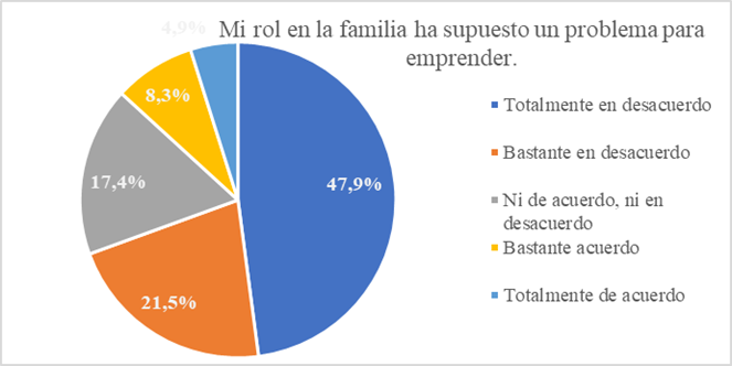 La búsqueda de socios y conocer los gustos de los clientes se sitúan a mitad de la tabla, seguidos por el conocimiento técnico. Considerando esto, junto con el conocimiento sobre la creación de empresa como reto mayor, nos hace pensar que la mayoría de las emprendedoras son especialistas en su ámbito, pero que la creación de la empresa en sí supuso un reto. Cabe destacar que la conciliación con la vida familiar aparece muy abajo en la tabla, no dándose aquí una asunción común en el emprendimiento femenino, que explica la menor tasa de emprendimiento entre mujeres por su rol en la familia, como se comentó anteriormente. Esto se evidencia más explícitamente cuando se les pregunta directamente por esta cuestión y casi un 70% afirma que su rol en la familia no les ha supuesto un problema a la hora de emprender (ver gráfico más abajo). Aquí hay que considerar que la mayoría de las emprendedoras no tienen hijos y el gran apoyo familiar que afirman haber recibido. Finalmente, el acceso a canales de distribución y a servicios complementarios no fueron problemas a la hora de emprender.