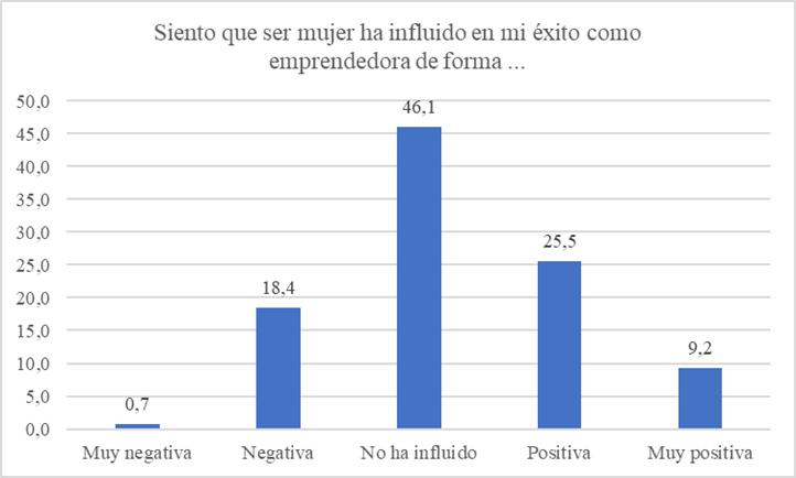En general, el hecho de ser mujer no ha influido en ningún sentido en el emprendimiento para el 46,1%, influyendo en sentido positivo o muy positivo para un 25,5% y 9,2%, respectivamente. Por el contrario, un 18,4% piensa que influyó negativamente.