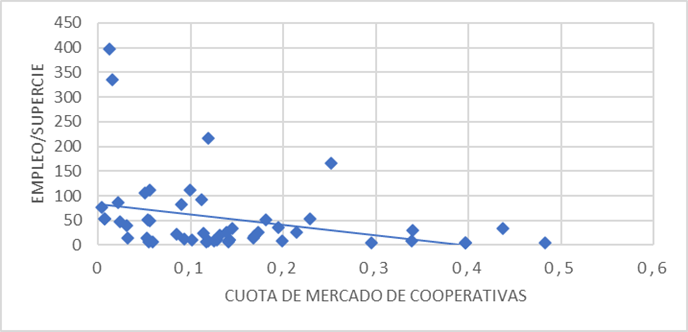 En España se evidencia el mayor peso de las cooperativas de crédito en aquellas regiones donde la densidad de población es menor (vid tabla 4.1), es decir, donde los procesos de despoblación generalmente son más intensos. Este hecho permite observar lo descrito con anterioridad, y es que, las cooperativas de crédito se instalan en los nichos de mercado que deja el resto del sistema bancario, prestando servicios financieros en aquellos espacios donde el riesgo de exclusión financiera es elevado. Así, presentan una presencia superior al 12% en provincias como Albacete, Almería, Álava, Asturias, Badajoz, Burgos, Castellón, Ciudad Real, Cuenca, Gipuzkoa, Granada, Huelva, Huesca, Jaén, Murcia, Navarra, Palencia, Rioja, Salamanca, Soria, Teruel, Toledo, Valladolid y Zamora, provincias que en su mayoría sufren despoblación.