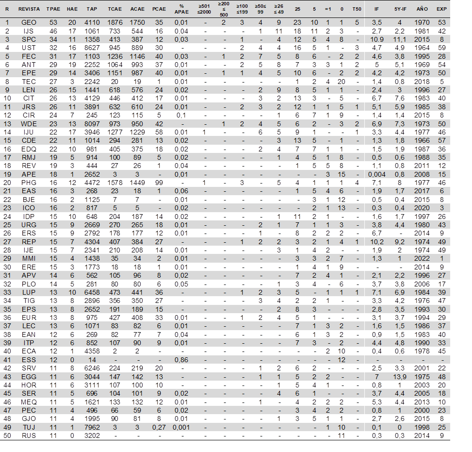 En esta sección se presentan los resultados obtenidos del análisis bibliométrico desarrollado para la elaboración del presente artículo. Cada una de las tablas y los gráficos elaborados sintetiza la información más relevante con los indicadores cuantitativos señalados anteriormente en el apartado de metodología. Téngase en cuenta que los acrónimos de los indicadores que aparecen en las tablas se encuentran descritos en el apéndice 1 y 2, al final del documento.