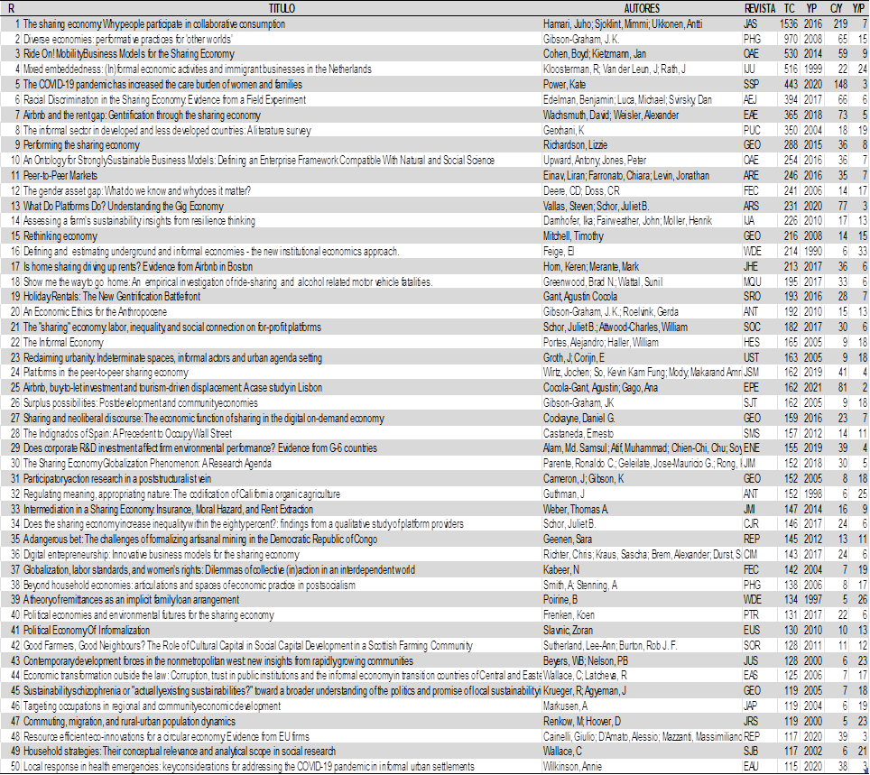 Así mismo los libros y capítulos de libros más citados dentro de este análisis bibliométrico se orientan principalmente al estudio de la economía colaborativa. Conceptos como “El capitalismo basado en las masas” (Sundararajan, 2016), es presentado como una nueva forma de hacer economía y plantea aquellos desafíos más relevantes y algunas limitaciones tanto para la transformación del tejido social y la regulación gubernamental.