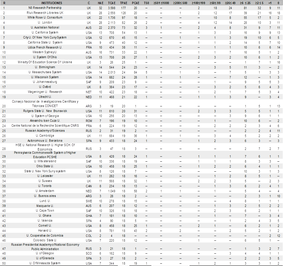 La utilización de herramientas investigativas tales como la bibliometría y el mapeo científico, nos han permitido disminuir esa limitación y realizar un análisis de rendimiento midiendo la productividad de los autores, países e instituciones que vienen trabajando en el tema a través de la utilización de indicadores como el H-índex, indicadores de citación y productividad, utilizados en la realización de las tablas bibliométricas que como se observa en los resultados, nos facilitan una visión panorámica general sobre las AE y su evolución en el tiempo. Estos resultados nos han permitido concluir lo siguiente: