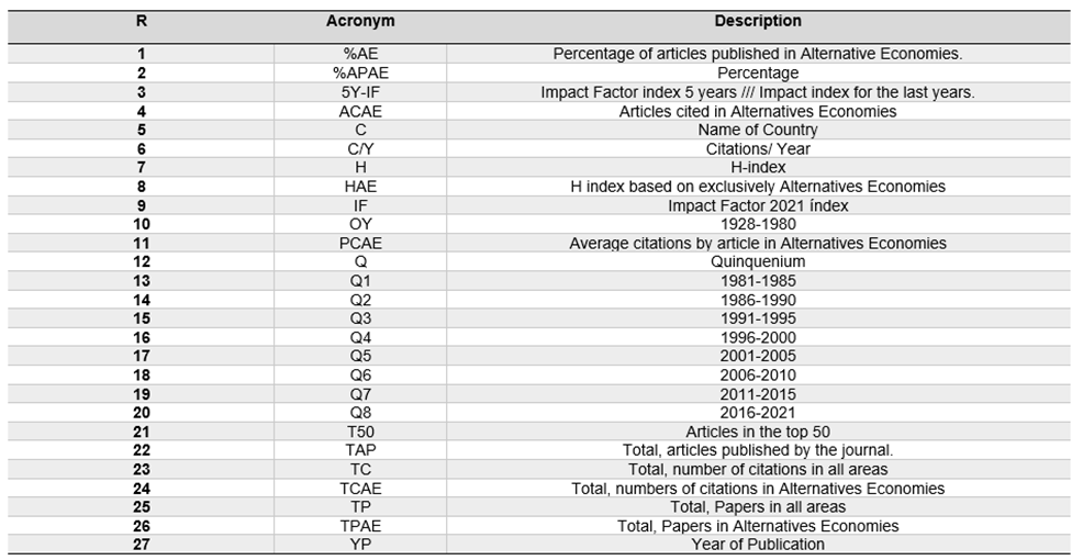 Para determinar la producción científica sobre el campo de las economías alternativas (AE, de aquí en adelante) se hace uso de un análisis bibliométrico y de un análisis de mapeo gráfico. El análisis bibliométrico es una metodología útil para representar un panorama general de las tendencias, de los autores, las organizaciones y países en la investigación de las AE. La bibliometría es un área de investigación de las ciencias bibliotecarias y de la información (Broadus, 1987) y proporciona datos bibliográficos generales utilizando métodos cuantitativos. Para el análisis de los datos bibliométricos se utilizó indicadores de producción que miden el número de artículos publicados (TPAE) por autor, revista, organizaciones, universidades, países y la evolución en años. Además, se considera el número de citas (TCAE), el promedio de citas (PCAE), el factor de impacto de la revista (IF) y el H-INDEX. Este último es un indicador que integra el impacto de las citas y la productividad (Hirsch, 2005).