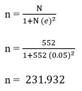 However, it is both impractical and difficult to examine every single element of the population as a whole, due to such restrictions and constraints involving time, human resources, costs and location (Bhattacherjee, 2012; Zikmund, Carr, and Griffin, 2013). According to Malhotra (2013), it is, therefore, necessary to use a sufficient number of respondents in the sample population instead of a full census. Thus, determination of sample size was calculated using Yamane's (1967) sample size determination equation to ensure sufficient, accurate, and credible sample representative for this study. Subsequently, the calculation to identify the suitable sample size is shown using Yamane's formula below and the suggested number of samples estimated for this study are 232 samples to obtain a representative sample of the population.