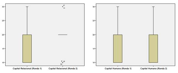 En primer lugar, los resultados procedentes del tratamiento de las opiniones respecto a la importancia de los bloques del capital intelectual han generado tras la segunda vuelta una respuesta clara: el capital relacional es –tras el humano- el más relevante de los que integran el capital intelectual de una cooperativa de crédito. Tanto la tabla 1 como la figura 2, muestran como la distancia que separa al capital relacional del humano no es muy elevada y –de hecho- ha habido diversos expertos que opinaron que el relacional era el intangible fundamental en la banca cooperativa. No obstante, el consenso alrededor de su importancia es claro.