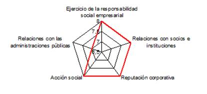 La figura 3 muestra –de forma gráfica- los anteriores resultados en un diagrama radial. De este modo, la gráfica pretende evidenciar el perfil caracterizador de los intangibles sociales en las cooperativas de crédito.