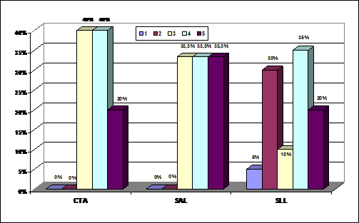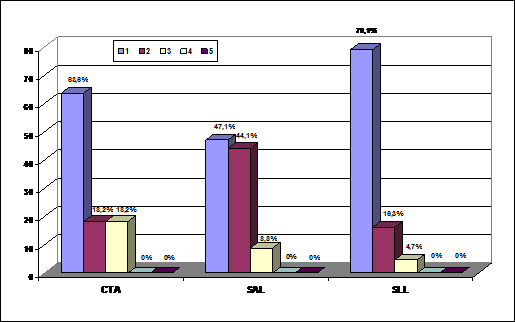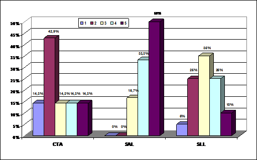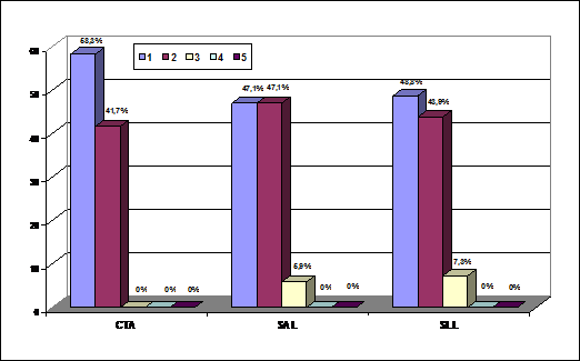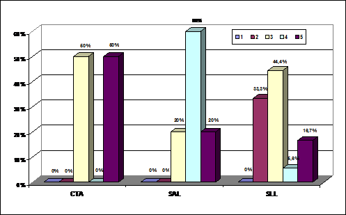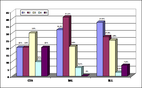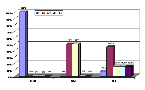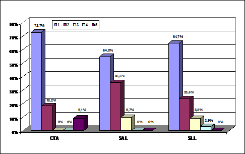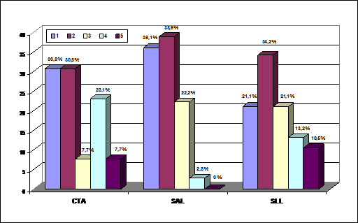 Analizando únicamente a las entidades que le otorgan algún valor a la RSC se observa que entre las distintas sociedades, tanto en las SALs como CTAs sólo hay, algo más de un 20 por ciento de las entidades que asignan una gran importancia a la RSC (entre los grados 4 y 5). Concretamente se trata del 30,77 por ciento de las CTAs y del 23,69 por ciento de las SLLs. Estos datos indican que sigue predominando una reducida valoración de la RSC, aunque se aprecia como un número considerable de entidades empiezan a concebirla como un elemento a tener en cuenta. La citada situación contrasta con el caso de las SALs en las que sólo un 2,78 por ciento de las entidades que valoran a la RSC lo hacen con un grado de importancia elevado.