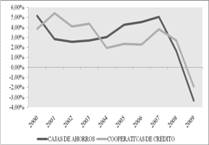 4) Las cooperativas de crédito han vivido hasta finales de 2009 un fortísimo incremento en su red de oficinas, lo que muestra su interés por desarrollar una banca universal, alejándose de su principio de territorialidad, pero manteniendo su identidad y ámbito rural. Las cajas de ahorros, han compartido esta tendencia de banca universal y han dirigido su crecimiento hacia aquellas provincias que han registrado mayores incrementos en el sector de la construcción, siendo más susceptibles a los efectos derivados de la crisis actual.
