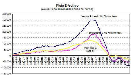 - El flujo efectivo crediticio anual al sector privado (calculado como variación del stock crediticio en un período de cuatro trimestres) en septiembre de 1997 era aproximadamente de 36 mil millones de euros, mientras que en diciembre de 2007 se aproximaba a los 250.000 millones, lo que supone que, en el momento álgido de la fase alcista del ciclo crediticio, el incremento anual del stock de crédito al sector privado equivalía al 25% del PIB anual.
