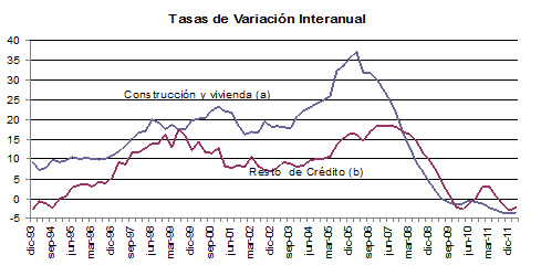 Si comparamos, por último, el comportamiento durante la fase bajista del ciclo crediticio de la financiación concedida a la construcción en sentido amplio, es decir, construcción, actividades inmobiliarias y adquisición y rehabilitación de viviendas, y el resto del crédito concedido, comprobamos un descenso medio anual del primero del 1,9% frente al 0,1% del resto del crédito. No obstante, esta mayor caída del crédito destinado a construcción y vivienda no ha supuesto una corrección importante en su desmesurado peso sobre el total del crédito, y así, en el primer trimestre de 2012, seguía representando un 58,9% del mismo.