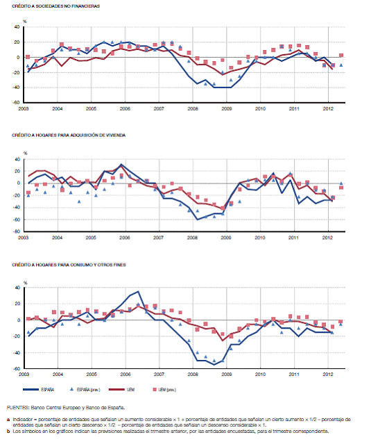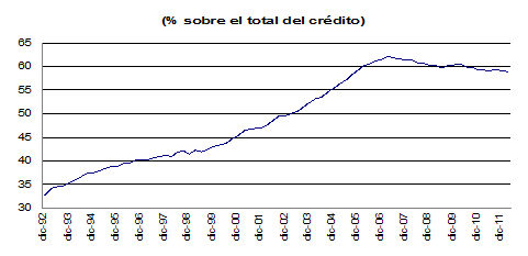 Una de las características de la economía española durante este período de crisis está siendo la contracción del crédito al sector privado. Este hecho es especialmente relevante para el funcionamiento de nuestra economía, dado que en España, al igual que en el resto de la zona del euro y a diferencia de Estados Unidos, los préstamos bancarios constituyen la principal fuente de financiación externa. En concreto, en 2011 los préstamos de las entidades crediticias residentes representaban en torno al 80% del total de la financiación del conjunto de los hogares y de las sociedades no financieras.