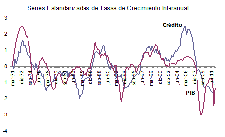 [4] Dado que estamos considerando una serie estandarizada, un valor de uno representa una desviación típica por encima del crecimiento medio del crédito de la serie original. Como la desviación típica para el período considerado presenta un valor de 7,2 y la media del período es 6,3, el valor de la serie original sería de 13,5.