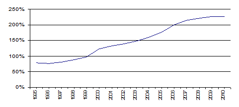 - En tercero, si tenemos en cuenta, además de la financiación mediante créditos, la obtenida a través de emisiones de valores (Gráfico 9), lo cual resulta otra forma de financiación del sector de sociedades no financieras, y lo comparamos con la conseguida exclusivamente a través de créditos, podemos comprobar que también se ha producido un crecimiento significativo de la financiación del sector privado a través de títulos, pues mientras que en 1995, el endeudamiento de este sector equivalía al 80% del PIB español, con casi 15 puntos correspondientes al endeudamiento a través de valores, a finales de 2010, suponía prácticamente el 230% de nuestra producción, cuando la correspondiente al crédito era del 160%. Así pues, en 2010, el endeudamiento a través de la emisión de valores era del 70% aproximadamente del PIB español, más de 50 puntos que el de quince años antes.