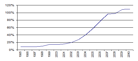 - Finalmente, este excesivo endeudamiento del sector privado no se ha financiado mediante el ahorro nacional, canalizado a través de las instituciones financieras, sino que éstas, para atender a la demanda creciente de financiación, han tenido que acumular niveles de deuda muy elevados, que han venido creciendo de forma ininterrumpida desde prácticamente los primeros años del nuevo siglo (Gráfico 10). En efecto, como podemos comprobar en el gráfico, mientras que durante los años noventa el nivel de endeudamiento en relación al PIB del sector de instituciones financieras se mantuvo bastante estable entre el 10% y el 20%, a partir de 2003 inicia una escalada, que lo sitúa en el momento del inicio de la crisis, en 2007, cerca del valor de nuestra producción, manteniéndose estable en 2008, para volver a crecer en 2009 (hasta el 110%), que es el nivel de endeudamiento actual.
