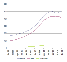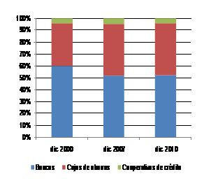 Por otro lado, si nos fijamos en la participación de cada grupo institucional en este crédito, mientras que las cooperativas han mantenido en todo el período una situación estable (entre el 4,3% y el 4,6%), las cajas de ahorros ganaron una cuota significativa sobre la banca, pues, a finales de 2000, estas entidades participaban en el 35,4% del total (60,3% de la banca), mientras que, a finales de 2007, se situaban en el 43,9% (frente al 51,5%), cuotas que se mantuvieron muy próximas a finales de 2010.