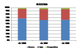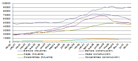 De su contenido destaca la mayor relevancia de la banca en el crédito industrial y de las cajas de ahorros en el de la construcción. Ahora bien, el crecimiento de este último tipo de crédito ha sido significativo antes de la crisis en los tres grupos institucionales, fundamentalmente en el sector de las cajas de ahorros, pues incluso a principios del período los bancos concedían un mayor volumen de este tipo de créditos. Además, la crisis le ha afectado en mayor medida, cayendo los concedidos, incluso de forma importante, sobre todo desde 2008, aunque en las cajas el deterioro del crédito también ha sido patente en el industrial, el cual en cambio se ha mostrado con un cierto estancamiento en los bancos y en las cooperativas.
