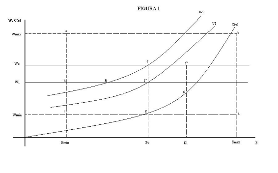 En la figura 1 representamos el equilibrio del trabajador que recibe un salario fijo (w0) a cambio del esfuerzo que dedica a la empresa, aunque dicho esfuerzo representa un coste para él. El área representada por el rectángulo abcd incluye todos los posibles puntos de equilibrio. Esta área está acotada por el salario máximo (wmax), dado por las posibilidades de supervivencia de la empresa, el salario mínimo (wmin), dado por la legislación laboral vigente, el esfuerzo máximo (emax), limitada por las condiciones físicas del trabajador, y el esfuerzo mínimo (emin), dado por la costumbre socialmente aceptada.