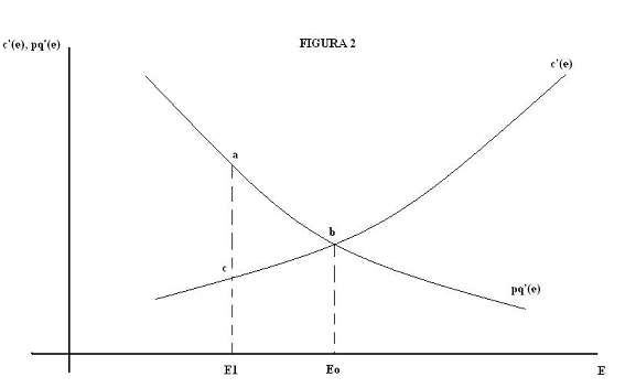 es decir, donde el valor de la productividad marginal del esfuerzo (decreciente) sea igual a su coste marginal (creciente). Para un esfuerzo inferior el valor de la productividad marginal del esfuerzo sería superior a su coste marginal, por lo que se dejarían de obtener las ganancias de las próximas unidades de esfuerzo. Para un esfuerzo superior al obtenido por la igualdad [4] el coste de las últimas unidades aportadas estaría por encima del valor producida por ellas. Un ejemplo del primer tipo de ineficiencia puede verse gráficamente en la figura 2. Si el esfuerzo aportado por el trabajador es, por ejemplo, e1, por debajo del nivel de eficiencia, e0, la ineficiencia sería igual al área abc de la figura.