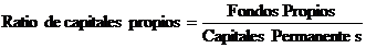 -          Ratio de capitales propios: cuanto mayor sea el peso que tienen los capitales propios sobre los capitales permanentes en la sociedad cooperativa, menor será el riesgo financiero de la misma (MARTÍN, LEJARRIAGA, ITURRIOZ, 2007), al reducirse en la misma la dependencia de la financiación ajena. Se calcula como: