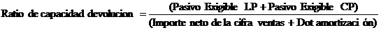-          Ratio de capacidad de devolución: Medido en función de la capacidad de devolución de la financiación ajena. Un valor elevado de este ratio indica un empeoramiento en la capacidad de devolución de los recursos ajenos.