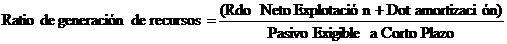 Mediante el ratio de generación de recursos, se ponen en relación los recursos generados por la sociedad cooperativa en el ejercicio con respecto a los recursos ajenos a corto plazo. De esta forma se determina el número de veces que está incluido el pasivo exigible a corto plazo en los recursos generados por la empresa, es decir, el número de veces que sería capaz la empresa de devolver las deudas contraídas con terceros con vencimiento inferior al año. Cuanto mayor sea este ratio menores serán los problemas de atención al pago por parte de la sociedad cooperativa al vencimiento de las deudas en el corto plazo.