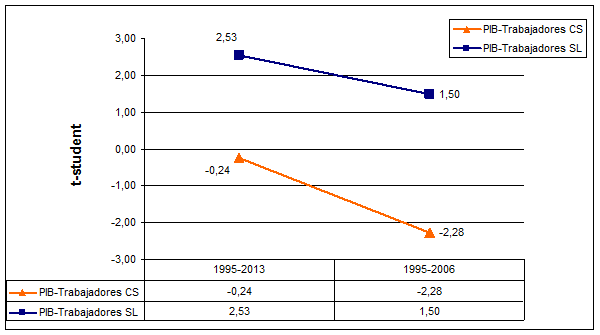 Los datos de la tabla 5 confirman el carácter pro-cíclico de las SL. La t-student es positiva y significativa en la estimación del coeficiente que relaciona el PIB y las dos variables de las SL. De nuevo se observa como el número de SL presenta una mayor alineación con la actividad económica que el número de trabajadores. Por lo que respecto a las CS, se reafirma su evolución al margen de la actividad económica. Ni el número de CS ni el número de trabajadores alcanzan una estimación significativa de su correlación con el PIB. Es más, el signo de la t-student de la estimación entre el PIB y el número de trabajadores es negativo. De lo que se deduce un comportamiento contra-cíclico, aunque no significativo, del número de trabajadores de las cooperativas. Resultado que vendría a avalar un leve efecto refugio del empleo en las cooperativas dentro de los años de estudio.