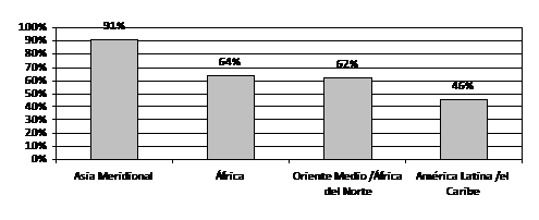 En relación a la tasa de cobertura, que es la relación entre las familias más pobres que recibieron un crédito y el total de familias que viven en la pobreza absoluta se puede observar que Asia Meridional es la única zona en que la tasa de cobertura guarda concordancia con el índice anterior (clientes en el umbral de la pobreza) con valores del 64% y un 56% respectivamente. La región de Asia Meridional es de hecho el único caso en el que ambos indicadores no muestran unas diferencias muy marcadas entre ellos, como sí lo es en las tres regiones restantes. En el caso de América Latina hay una diferencia de casi la mitad –con un 62% de clientes en el umbral de la pobreza y un 31,2% de tasa de cobertura-, lo que además es coherente con el valor del monto promedio de crédito que tiene esta región (USD 3.822). Ello se debe a que el acceso en América Latina está dirigido principalmente a pequeños y medianos empresarios, por lo tanto la gran mayoría de personas que se benefician no se encuentran en una situación de pobreza tan marcada, lo que inevitablemente limita la tasa de cobertura de la región. En cuanto a África y Oriente Medio/África del Norte, siendo zonas donde se concentra la mayor tasa de pobreza extrema en el mundo, desafortunadamente tiene la tasa más baja con un 9,8%.
