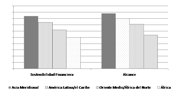 En la región de Asia Meridional, al ser la más poblada del mundo y la que más clientes tiene, las IMFs atienden a los más pobres y en su gran mayoría mujeres. En esta región el servicio del microcrédito evidencia tener un enfoque de “alivio de la pobreza”. Igualmente se podría pensar que entregar el servicio del microcrédito con una perspectiva social, extrema los riesgos, los costos, poniendo en riesgo la sostenibilidad financiera de la IMF por lo que sería más seguro enfocarse en un mayor grado en la perspectiva financiera. Sin embargo, los índices de Asia Meridional demuestran que ello no tiene que ser necesariamente así, ya que estas IMFs tienen un alcance sostenible debido al gran número de clientes, lo que evidencia que está siendo una buena vía para contribuir a la disminución de la pobreza, a través de la combinación de un servicio focalizado en la población vulnerable, con unas medidas orientadas a crear un sistema financiero competitivo y sostenible. Se confirma pues que el enfoque social sobre el que Asia Meridional ofrece el servicio de microcrédito es también un modelo financieramente viable. Justamente gracias a que es una región altamente productiva y maneja una gran escala de clientes, ello le permite brindar un acceso a un bajo coste.