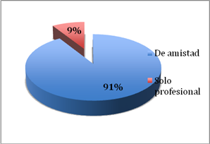 Por otro lado, la existencia de un buen clima laboral es fundamental en todas las organizaciones a la hora de garantizar un buen funcionamiento y unos estándares de productividad y calidad adecuados. Por ello, la relación que mantienen los miembros de una organización, como las sociedades laborales, de tamaño reducido y donde el trato con los compañeros es constante, resulta fundamental para la consecución del éxito empresarial. A este respecto el 90,73% de los socios manifiesta que entre los miembros de la organización existe una relación de amistad, frente a un 9,27% de los casos donde afirman que la relación es únicamente profesional.