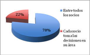 En cuanto al proceso de toma de decisiones, el 78,37% de las sociedades laborales manifiestan que la toma de decisiones se lleva a cabo entre todos los socios, mientras que el 21,63% de las mismas afirma que en su caso la toma de decisiones la realiza cada socio dentro de su área de responsabilidad.
