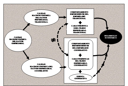 El modelo de enlace propuesto (figura 1) parte de la idea de que la calidad macroeconómica del factor empresarial de un territorio vendría determinada por la calidad del factor empresarial convencional y del cooperativo, actuando ambos de forma complementaria en su contribución al desarrollo.