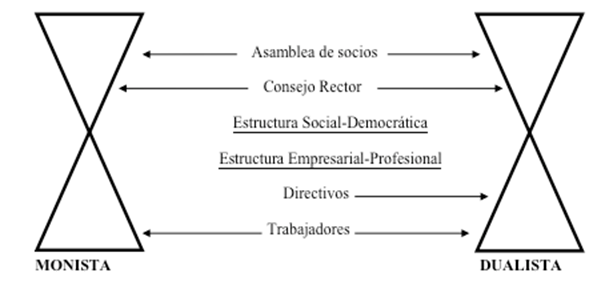 Dentro de la estructura de las organizaciones cooperativas se pueden establecer dos partes diferenciadas: la democrática y la estructura profesionalizada (Mozas, 2004). La estructura democrática es característica de las sociedades cooperativas puesto que el poder de decisión reside en los socios y es ejercido con carácter democrático. Por su parte, la estructura profesional refleja las relaciones existentes entre los trabajadores y los directivos. En esta estructura, la profesionalización de las actividades directivas permite distinguir entre modelos de gestión monista y dualista (ver Figura 1). La legislación española en materia de cooperativas es flexible y permite que éstas elijan su modelo de gestión (art. 32 de la Ley 27/1999).