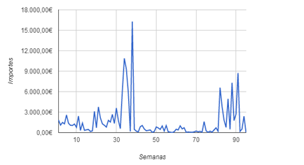 Figura. 4. Evolución por semanas de las donaciones en migranodearena.org a la Asociación Alba Pérez.