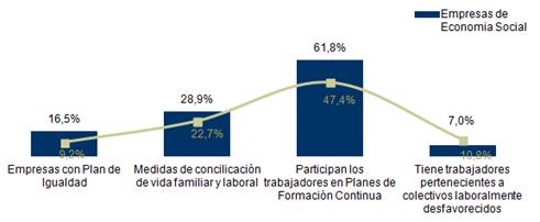 Con el objeto de analizar el grado de compromiso de las empresas de ES de la CV con sus trabajadores se consideran cuatro indicadores de comportamiento responsable: 1) la existencia de planes de igualdad; 2) la adopción de medidas de conciliación de la vida familiar y laboral; 3) la participación de los trabajadores en planes de formación continua, y 4) la integración en la plantilla de personas pertenecientes a colectivos desfavorecidos.