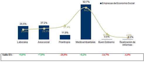 El gráfico siguiente recoge a modo de conclusión la comparativa de las prácticas de RSE de las empresas de ES, y el total de empresas de la CV. Como se observa las empresas de Economía Social se hallan superiormente comprometidas (con diferenciales superiores a 8 puntos ) respecto del total de empresas de la Comunidad en la práctica totalidad de los ítems que conforma la RSE interna, como es el compromiso social, laboral y medioambiental. No obstante, acusan un diferencial negativo en el área de Buen Gobierno, a pesar de la asunción de principios de gestión y dirección acordes con la RSE, como es el principio democrático, entre otros. Este diferencial es especialmente significativo en el terreno de la filantropía empresarial, paradójico en un sector institucional cuna de la filantropía, la solidaridad, y el voluntariado (Sajardo, 2012).