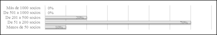 Finalmente, el número de asociados es un parámetro utilizado para determinar la dimensión de las cooperativas, y se transforma en un factor clave de éxito en la medida en la cual se le permita participar en la gestión de la institución solidaria; en el contexto de las cooperativas de ahorro y crédito de Barranquilla, los resultados de muestran que el 53% que integró la muestra se encuentra en un rango de 0 a 10 asociados, mientras que el 43% manifestó encontrarse en el intervalo de 11 a 50. Es importante demarcar, que solo el 3% declaró que sus socios sobrepasan los 201 (Ver gráfico 11).
